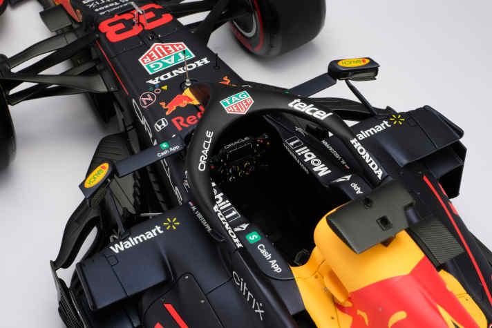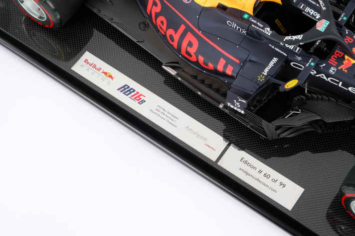 Bisher gab des den R16B bei Amalgam nur in der Fahrerversion Max Verstappen vom GP in Monaco und in der Piloten-Variante von Sergio Perez vom Rennen in Baku zu kaufen. Das Weltmeisterauto von Max aus Abu Dhabi kommt etwas später auch noch in einer 1:18-Version auf den Markt. Deren Preis ist aber noch nicht kalkuliert. Der 69 Zentimeter lange Flitzer von Max aus dem WM-Finale von Abu Dhabi in 1:8 wird weltweit nur 99-mal gebaut. Die Entwicklung dieser hochwertigen Miniatur hat ungefähr 2500 Stunden in Anspruch genommen. Das Team an ausgesuchten Handwerkern, das diese verkleinerten Meisterwerke in Bristol zusammenfügt und dekoriert, arbeitet pro Auto ungefähr 250 Stunden daran.