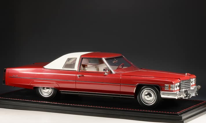 Eigentlich ist die Bezeichnung DeVille für ein zweitüriges Coupé eine Mogelpackung. Ein “Coupé de Ville” hatte ursprünglich den Zuschnitt einer Limousine. Vorne saß der Chauffeur auf seiner wahlweise nicht überdachten Sitzbank, hinten im Fond logierten in einem geschlossenen Abteil die solventen Fahrgäste. DeVille wurde aber bei Cadillac eine Typenbezeichnung für eine ganze Baureihe, die ab 1949 gefertigt wurde, aber eben als Sedan DeVille, Coupé DeVille oder auch Convertible DeVille, also in verschiedenen Karosserieformen. Die Schreibweise veränderte sich ebenfalls. Ab den Sechzigern setzte sich DeVille durch. Stamp Models hat sich für sein zweites 1:18-Modell ein DeVille-Coupé aus dem Baujahr 1974 ausgesucht. Diese Generation DeVille war in der Chronologie die vierte und lief von 1971 bis 1976 von den Produktionsbändern der Edelmarke aus dem Chevrolet-Konzern. Stamp baut ein Resinemodell mit unglaublich perfekt verarbeitetem Chromzierrat, das mit einem makellosen Lack glänzen kann und mit Textilsockel zum Kunden kommt.