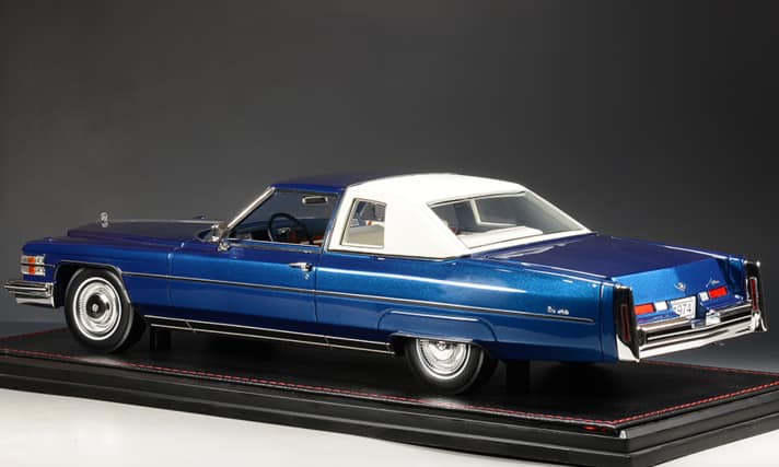 Stamp liefert seinen Neuzugang in Persian Lime Firemist, Regal Blue Firemist und Dakota Red aus und kombiniert diese drei Karosseriefarben jeweils mit einem weißen Vinyldach, das hinter der B-Säule beginnt. Die Interieurs tragen ebenfalls Weiß und die Armaturentafeln sind dagegen passend zur Karosseriefarbe koloriert. Die Reifen haben weiße Zierringe, die Felgen sind mit vollverchromten Radkappen verkleidet. Den ersten Eycatcher liefert Stamp bei seinem Neuheiten-Trio bereits mit der hochglänzenden Lackierung. Zusammen mit dem exzellent verarbeiteten Chromzierrat trifft die 1:18-Verkleinerung dann auch das ganz spezielle Auftreten eines Cadillacs aus den Siebzigern. Zumal die Entwickler die Proportionen ebenfalls sehr gut nachbilden.