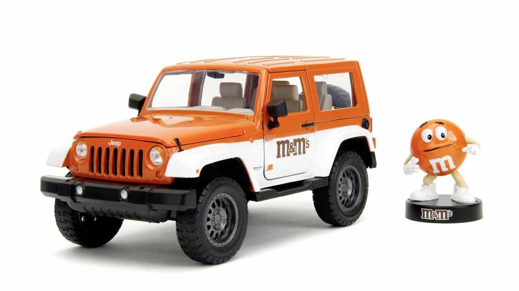 Solche Süßigkeiten setzten in Kalifornien spezielle Think-Tanks in Gang, die sich gerne in Form von coolen Modellautos für ihre Kunden austoben. Jada Toys ist spitzenklasse in dieser Disziplin. Also kommen jetzt gleich vier verschiedene 1:24-Modelle in schwerer Die-Cast-Qualität als 1:24er auf den Markt, die jeweils mit einer M&M-Figur in der Packung eingeparkt sind. Das jüngste Autovorbild ist dabei ein Jeep Wrangler in Orange mit farblich abgestimmter Figur. Der Offroader nach dem Vorbildbaujahr 2007 hat bewegliche Motorhaube und Türen.