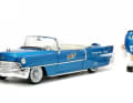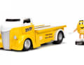 Auch Nutzfahrzeuge sind bei dieser Serie mit im Fuhrpark. Zum schwarzen und extrem tierfergelegten Ford Ecoline von 1965 als Bus mischt Jada ein rotes Männchen dazu. Beim US-Bulli lassen sich die Vorder- und Seitentüren öffnen. Der Abschleppwagen des Ford COE aus den späten Vierzigern fährt in Gelb und Weiß vor, hat bewegliche Türen und kommt mit gelber Figur im Karton. Wesentlich luxuriöser setzt sich das vierte Set in Szene. Ton in Ton in Blau treten das ‘56 Cadillac Fleetwood Eldorado Convertible und die M&M-Figur in 1:24 an. Egal, welches Modellauto der Fan wählt, bei Jada kosten die Sets mit Figur zusammen einheitlich 39,99 Euro.